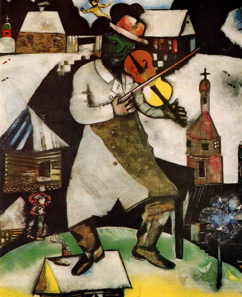 Огромный, безудержно счастливый скрипач Шагала, кажется, способен воспарить над миром. Дома, церкви и деревья выглядят миниатюрными с его головокружительной высоты. Все вращается вокруг его музыки. Пространство размыкается и смыкается вновь, следуя ритму, задаваемому скрипачом. Видно, что Шагал долго размышлял над открытиями авангардистских течений, зародившихся и развивавшихся в Париже. Выработав интернациональный художественный язык, Шагал смог осуществить последовательное и полное переосмысление пространства живописи.