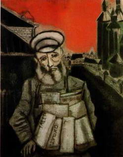 Еврей надевает на себя во время молитвы талес (белое покрывало с бахромой) и тефелины (коробочки, прикрепляющиеся к голове и к рукам), содержащие тексты Торы. Внизу слева - "Продавец газет" (1914, Париж, Национальный музей современного искусства); справа - "Еврей в розовом" (1914-1915), Санкт- Петербург, Государственный русский музей).