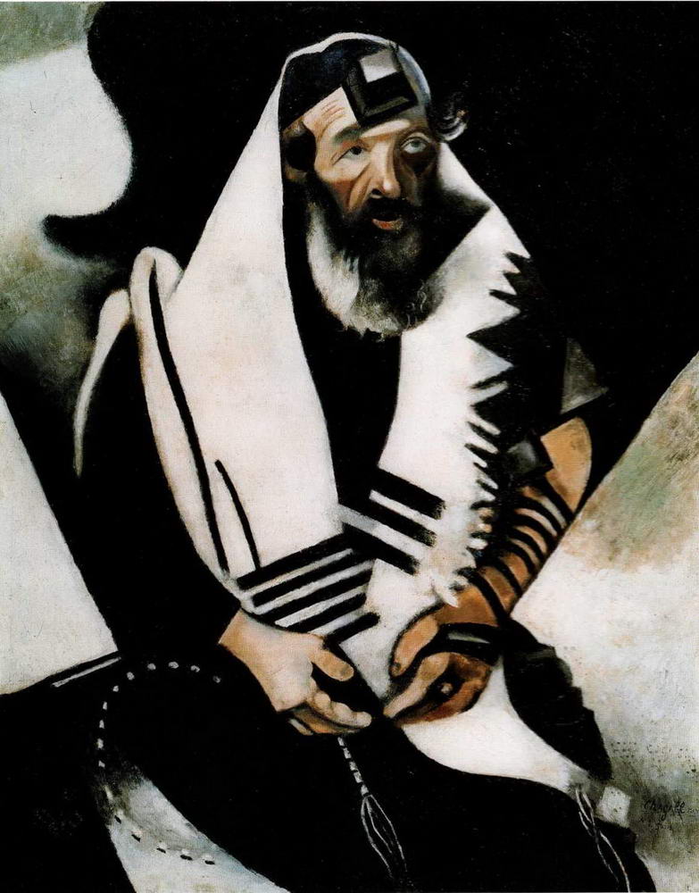 Картина относится к циклу портретов стариков и евреев, к которому принадлежат также полотна "Продавец газет", "Раввин" (см. стр. 13), "Еврей в красном" и "Еврей в розовом". Для этих картин Шагалу позировали странствующие хасиды, которых Шагал, по его собственному свидетельству, встречал в Витебске с самого раннего детства. Человек на портрете одет в ритуальные одежды: так предписывалось одеваться каждому правоверному еврею на утреннюю молитву или отправляясь в синагогу: В отличие от часто встречающихся у Шагала изображений крестьян и простого люда города Витебска, образ раввина подчеркнуто монументален. Композиция картины позволяет достичь особого эффекта при минимуме художественных средств, так что реалистической манере изображения лица противопоставляется схематизм облачения. Черные полосы на талесе и тефелине превращаются в геометрические и структурные элементы, придающие фигуре пластическую выразительность.