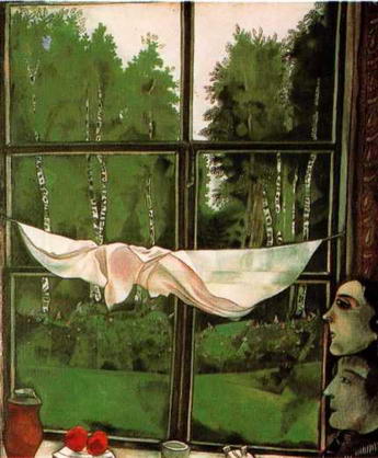 Справа - "Вид из окна" (1915); внизу - "Окно с видом в сад" (1917, Санкт-Петербург, Музей Бродского). Сравнение двух картин показывает, как далеко ушел Шагал от беспокойного прошлого. Будущая жизнь сулит ему безмятежность и гармонию, выраженные в пейзаже.