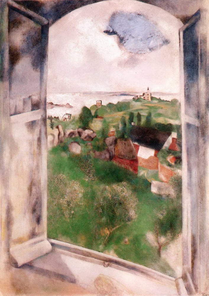 Вернувшись во Францию после бурных лет, проведенных в России, Шагал переживает краткий период творческой растерянности. И как было свойственно ему в такие минуты, художник стремится найти источник силы и веры в себе самом, укрывшись в собственном семейном микромире. Открытое окно дает возможность чувству внутреннего умиротворения излиться во внешнюю жизнь. Вся картина подернута легким налетом лучезарного, чистого воздуха, приводящим к гармоничному созвучию микро- и макромиры. На всей поверхности полотна Шагал использует секрет изящного жидкого мазка, что свидетельствует о преклонении художника перед Моне и еще в большей степени перед Боннаром - мастером задушевного лиризма. Сцены из жизни, смягченные поэзией и преломленные во сне, уступают место радости созерцания. Неосязаемая атмосфера обволакивает всю композицию. Небо и облако пейзажа имеют ту же излучающую свет фактуру, что и окно и подоконник на первом плане.