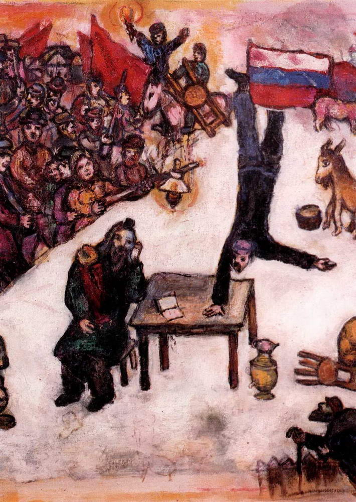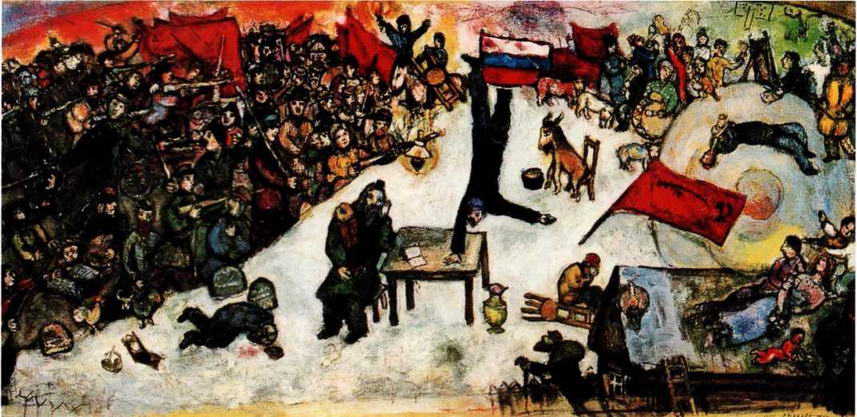 В этом полотне большого формата революция представлена в самых болезненных, трагических, иррациональных своих аспектах. Ленин изображен вверх ногами и вовсе не возглавляет шумную народную толпу с оружием и знаменами, словно вызванную к жизни его фантазией. Священное Писание погружает молящегося в недоуменное размышление, а Вечный Жид не прерывает своего бесконечного пути. Не подвластный влиянию окружающего мира и истории, Вечный Жид сохраняет дистанцию между собой и событиями. Пара влюбленных, если присмотреться получше, также не считает нужным забыть о своих чувствах: только мужчина слегка приподнимает голову, чтобы оглядеться вокруг. Безучастное спокойствие животных, возможно, являет собой образец поведения. Бурные приливы и отливы революции выглядят как гигантский, оглушительный и абсурдный массовый театр. В последующие годы Шагал счел, что над картиной слишком довлеет политическое содержание в ущерб общему поэтическому эффекту, и решил разрезать полотно на три части.