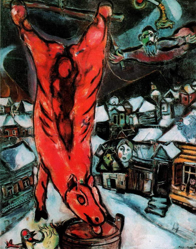 "Освежеванный бык" завершает начатую "Революцией" (см. стр. 54) и "Белым Распятием" (см. стр. 56) триаду произведений, содержащих политическую концепцию человека и истории. Шагал считал, что задача художника заключается в том, чтобы вносить в жизнь поэзию. Безучастно относясь к требованию политической тенденциозности и пропагандистской направленности искусства, он со всей тщательностью отражал и обличал в своем творчестве политические события и режимы, оскорбляющие достоинство человека. Будучи очевидцем преследований евреев, он познал и ощутил истинный смысл страдания. "Освежеванный бык" - это яркая метафора, располагающая к размышлению. Убитое животное по своей сакральности приближается к образу религиозного культа. Горестные эмоции, вызванные его закланием, ничем не уступают скорбному настроению религиозной сцены. Как всегда у Шагала, боль и скорбь не беспросветны. Не исключено, что жестокость по отношению к животному приведет к расцвету такого уклада, где человек вновь обретет радость жизни в упорядоченной и тихой гармонии, подобной снежному пейзажу.