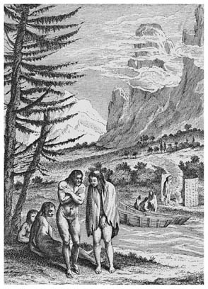Туземцы Магелланова пролива, которых называли патагонцами, с их хижинами и лодками