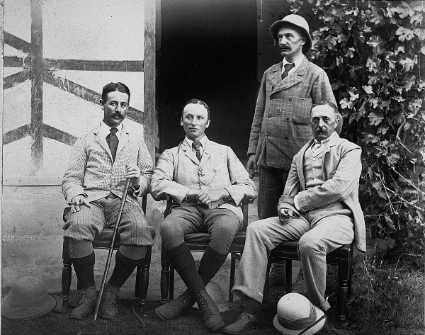 На русском пограничном посту Кила Санг-и-Дивар. Группа мужчин в пробковых шлемах (слева направо): британский посол в Тегеране сэр А. Хардинг, секретарь британского посольства в Тегеране Дж. Черчиль, британский генеральный консул в Мешхеде полковник П. Сайкс. Фото Дж. Уотсона. Около 1905 г.© The British Library, London. India Office Photographs, 851/3(15). Публикуется впервые