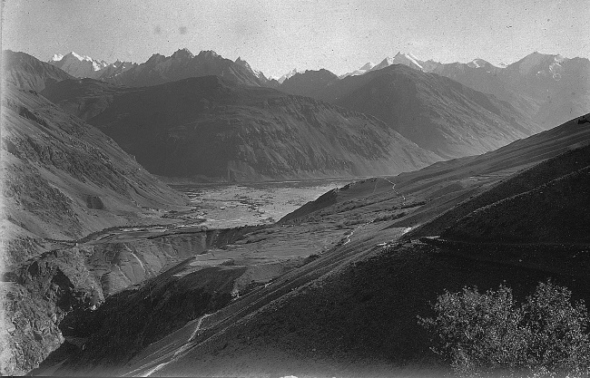Место слияния р. Памир (в ущелье слева) с р. Вахан (по центру снимка) – зарождение р. Пяндж. Вдали – вход в Ваханский коридор и горы Гиндукуша. Внизу за склоном горы (справа) напротив входа в Ваханское ущелье – русский Лянгарский пост. Фото известного британского археолога Аурела Стайна. 30 августа 1915 г. © The British Library, London. India Office Photographs, 392/29(453). Публикуется впервые