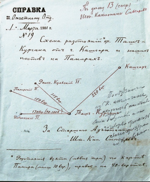 А. Е. Снесарев. Схема расстояний от кр. Ташкурган до русских постов на Памире. Автограф рукописи. Частная коллекция. Великобритания. Публикуется впервые