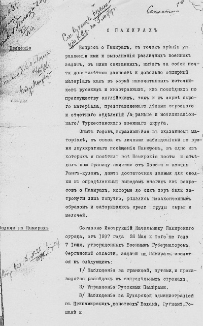 Титульный лист записки А. Е. Снесарева «О Памирах»