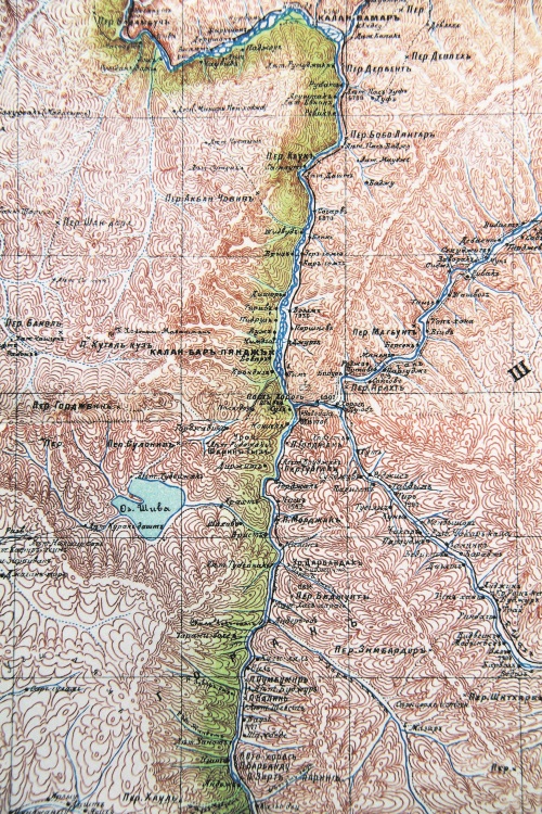 Верхнее течение р. Пяндж. Район Хорогского поста. Фрагмент 10-верстной карты Памира издания Туркестанского ВТО. Частная коллекция. Великобритания
