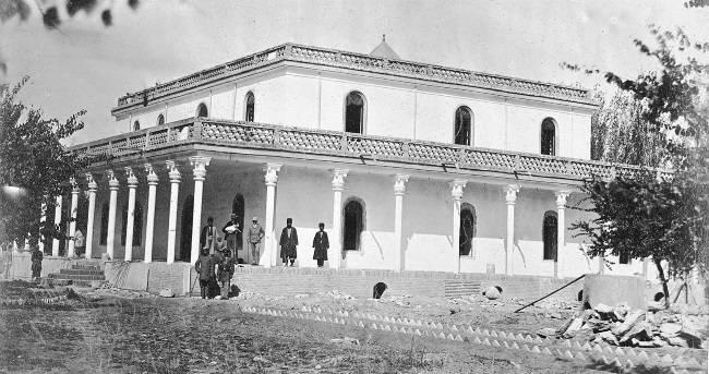 Британское генеральное консульство в Мешхеде, в котором располагалась резидентура британской военной разведки, действовавшей в Русском Туркестане. В группе между колонн (третий слева с тросточкой) – капитан Нэйпир, которого А. Е. Снесарев сопровождал в поездке по Туркестану в 1904 г. Фото 1893 г. © The British Library, London. India Office Photographs, 430/69(13). Публикуется впервые
