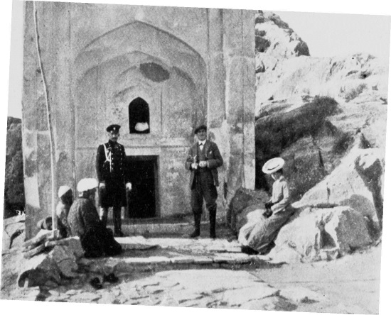 А. Е. Снесарев, спутник А. Гамильтона и Евгения Зайцева у мечети Тахт-и Сулейман. Фото А. Гамильтона. 1904 г. АСС