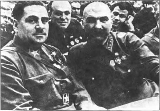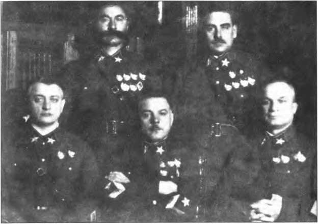 Сидят: М. Тухачевский, К, Ворошилов, А. Егоров. Стоят: С. Буденный, В. Блюхер