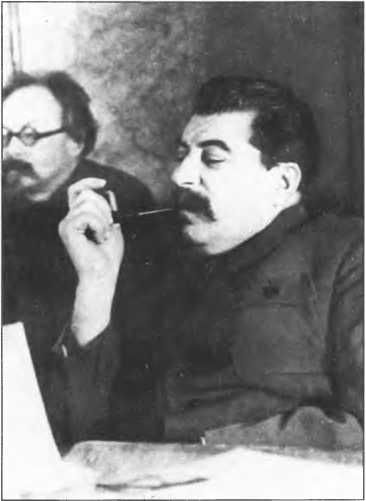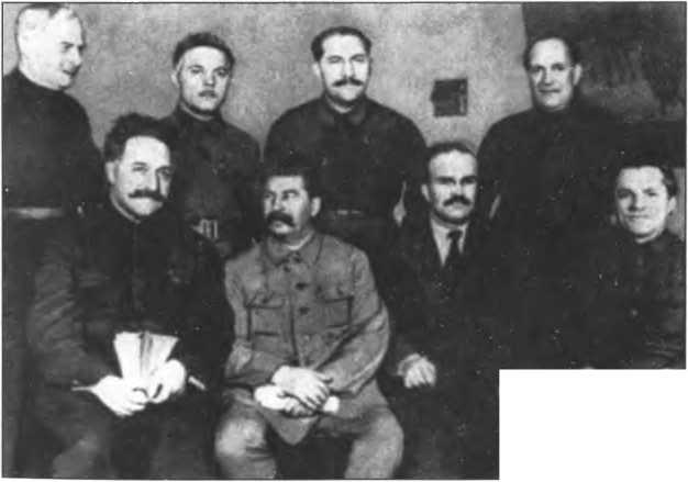 Сидят: Г. К. Орджоникидзе, И. В. Сталин, В. М. Молотов, С. М. Киров. Стоят: А. С. Енукидзе, К. Е. Ворошилов, Л. М. Каганович, В. В. Куйбышев