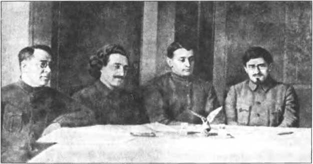 Реввоенсовет Кавказского фронта. Слева направо: С. И. Гусев, Г. К Орджоникидзе, М. Н. Тухачевский, В. А. Трифонов. 1920 г.