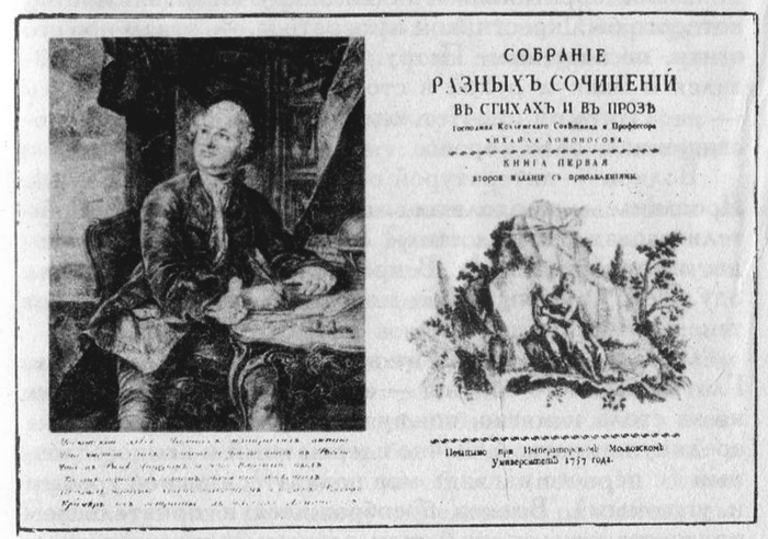 Фронтиспис и титульный лист «Собрания разных сочинений…» М. В. Ломоносова.