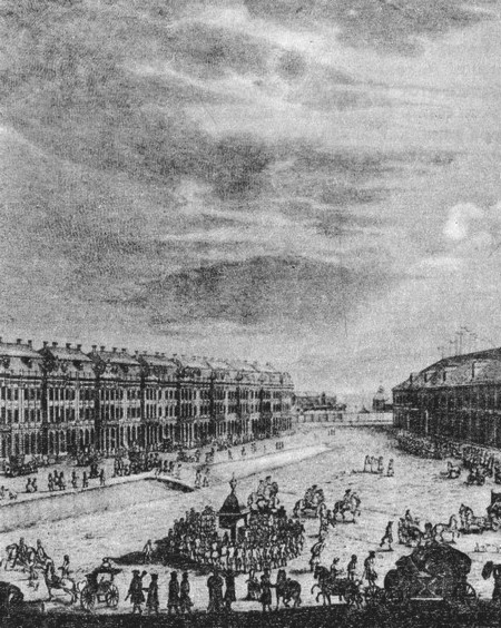 Волков и еще несколько человек быстро пошли вперед по набережной, — горело, видимо, в районе таможни и биржи. Там, у главных торговых пристаней находился кладовой гостиный двор, где хранились привозные и отправляемые за море товары. С Адмиралтейской стороны по Исаакиевскому мосту вскачь, с колокольным боем уже неслось несколько пожарных повозок. За зданием Двенадцати коллегий идущие свернули налево, к площади, где стоял высокий полосатый столб с навесом, у которого глашатаи обычно читали народу правительственные указы. Навстречу двигались десятки запряженных порожних телег, — располагавшиеся неподалеку постоем торговые ямщики уводили лошадей подальше от огня. На площади росла толпа сбегавшихся отовсюду людей. Горели амбары с пенькой и льном. Волков с друзьями подошел ближе. Какой-то седобородый старик, истово крестясь, говорил: