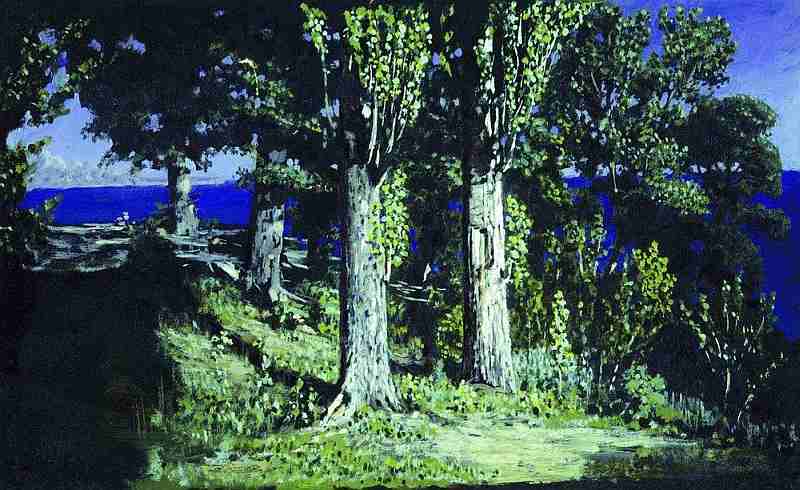 В «Березовой роще» (1879, Государственная Третьяковская галерея, Москва) нет даже намека на унылое русское бытие. На картине изображен радостнотомительный солнечный день в чистых, звучных, даже «звонких» красках. От контрастного сочетания цветов возникает ощущение блеска. Картина будто залита солнечным светом, от которого хочется прищуриться! Необычную сочность придает ей зеленый цвет, проникающий всюду. Этот потрясающий эффект, полученный контрастом цветов, создает впечатление умиротворения, ясности, гармонии, словно ощутимых физически. В «Березовой роще» так же, как и в «Украинской ночи», художник добился декоративного эффекта.