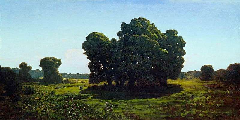 Элементы стилизации линий и форм обнаруживаются в картине «Дубы». Перед нами — группа могучих деревьев с густой кроной и богатой листвой стоит тяжелым, мощным силуэтом. На первый план от них падает плотная тень. По ясному небу плывут редкие, легкие, светящиеся облака. В работе очевидно романтическое восприятие природы. Куинджи с присущей ему зоркостью и точностью зрения улавливает в природе тончайшие нюансы цвета и удивительно мастерски их передает. Это отражено и в изображении легкого, безоблачного неба, и в солнечном свете, заливающем поляну, и в сочной траве, варьируют от светло- до темно-зеленого. В картине Куинджи просматривается композиционная параллель с работой Шишкина «Дубы. Стадо» (1887). Однако если в своем произведении Шишкин уделяет большое внимание деталям пейзажа, акцентируя их, то Куинджи, напротив, обобщает формы, создавая некую художественную метафору.