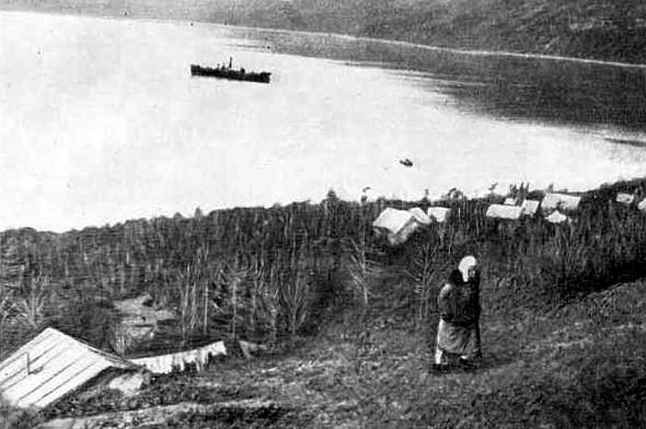 «Ситцевый городок» на берегу бухты Нагаева в 1931 году. На рейде пароход «Днепрострой».