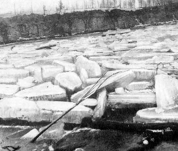 Начало ледохода на Тенке. Освободившись от ледяных оков, река бурно мчит нагромождения льдин вниз по течению.