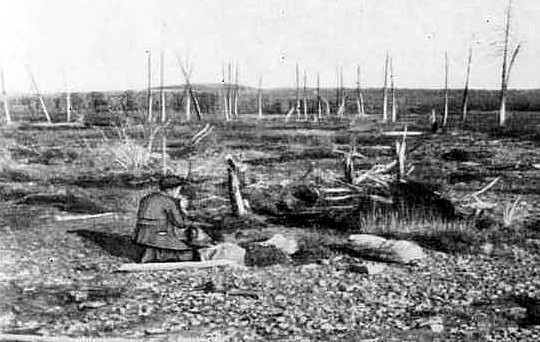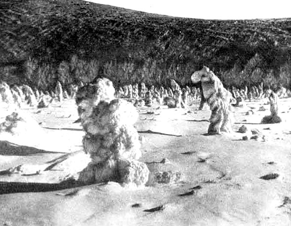 На месте растаявшей наледи осталась голая щебенистая поверхность с торчащими стволами мертвых, погубленных наледью деревьев.