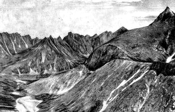 Вокруг громоздятся оголенные скалистые горы, на вершинах которых почти до конца августа сохраняются пятна снега.