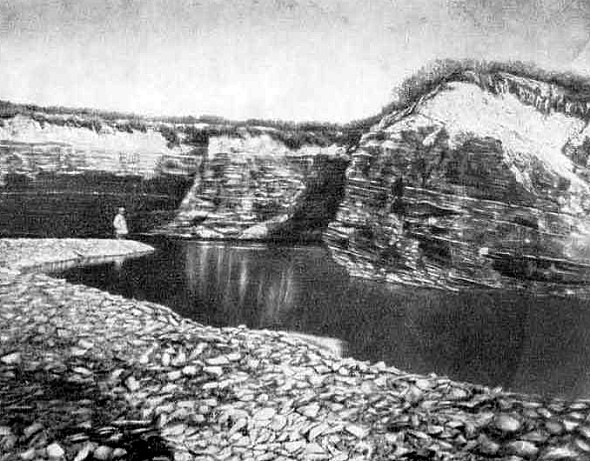 Шестиметровый пласт каменного угля, прикрытый шапкой галечных отложений, прорезается руслом ключа.
