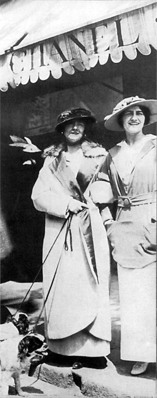 Довилль, 1913 г. Габриель (справа) позирует перед входом в свой первый бутик вместе с Адриенн. Обе одеты в костюмы и шляпы, продающиеся в магазине.