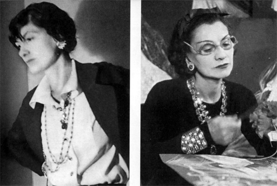 Для вечера она предложила платье из красной синели… Шанель конструирует из мехов, сочетая обезьяну с белой каракульчой. Вот еще вечерний туалет, предложенный Шанель: узкое прямое платье из белого атласа, поверх которого надета вышитая и украшенная жемчугом прямая блуза…»