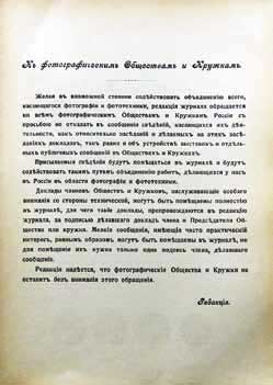 В это время С. М. Прокудин-Горский уже активно занимался цветной фотографией, выступал с демонстрациями снимков и докладами о технологическом процессе. Интерес к его сообщениям «о фотографии в натуральных цветах» был огромен. Поэтому еще в 1905 г., не думая быть редактором журнала, он начал писать руководство по данной теме. В 1906 г. оно выйдет в 12 номерах журнала. Каждый номер будет сопровождать художественное приложение: снимки, выполненные с натуры Прокудиным-Горским, и черно-белые изображения других авторов, представляющие художественную ценность. К иллюстрациям будут даваться пояснения: когда и в какое время суток они были сняты, при каких условиях, каким аппаратом и объективом, с какой экспозицией, каким проявителем проявлены негативы, на каких пластинах выполнены позитивные отпечатки. Цветные фотографии Прокудина-Горского вклеивались на цветной картон-паспарту вручную, иногда даже имели не очень ровно обрезанные края. Большинство из них со временем исчезли из библиотечных архивов, оставив картон со следами клея.