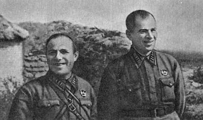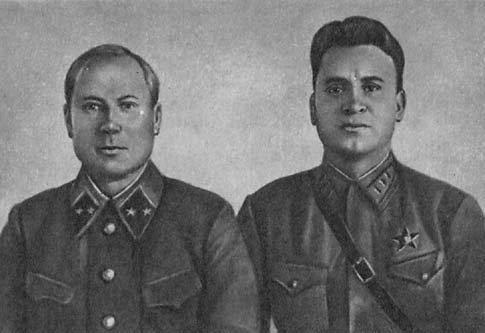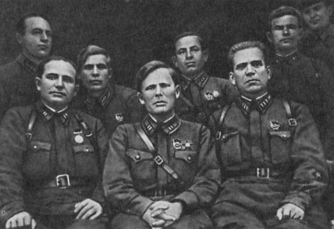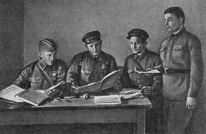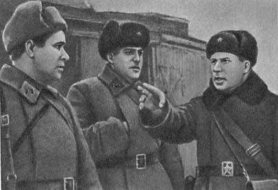 Перед началом Елецкой наступательной операции И. Н. Руссиянов (справа) ставит задачу командиру 4-го Воронежского полка М. Е. Вайцеховскому (в центре) и комиссару Н. П. Латышеву