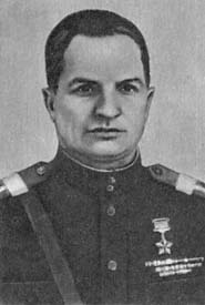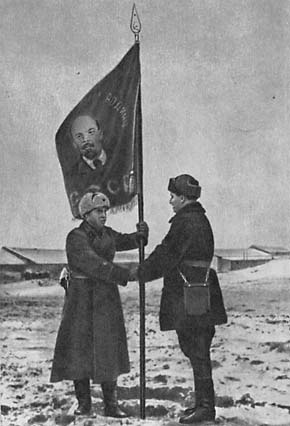 Бригадный комиссар И. И. Михальчук вручает гвардейское Знамя комиссару 1-й гвардейской ордена Ленина стрелковой дивизии К. И. Филяшкину