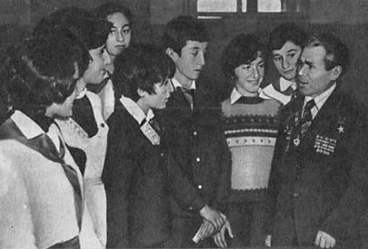 Ветеран 1-го гвардейского механизированного корпуса Герой Социалистического Труда Ф. И. Шалин рассказывает школьникам о прошедшей войне