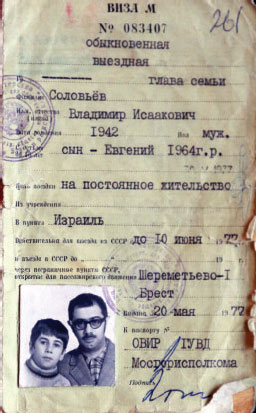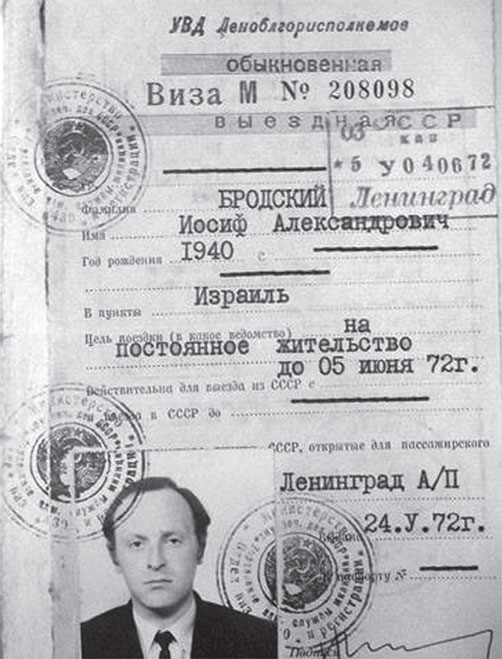 Две выездные визы. По одной из них в 1972 году выехал из Ленинграда Иосиф Бродский, а по другой спустя пять лет выехали, уже из Москвы, Владимир Соловьев и Елена Клепикова с сыном Евгением.