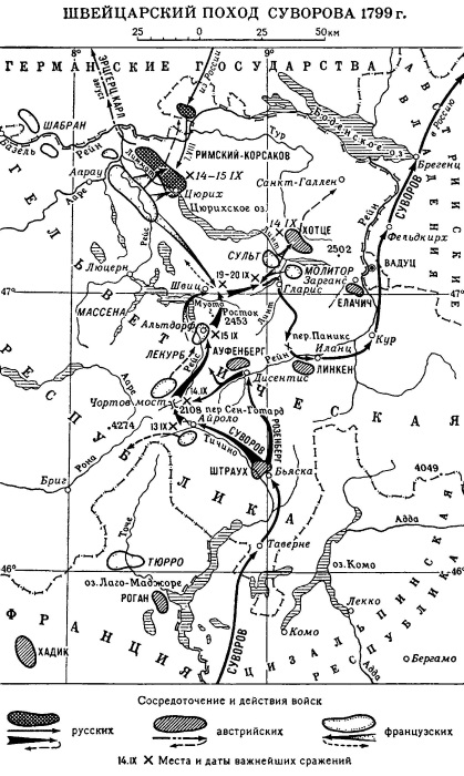 Армия Суворова тоже попала в окружение, и у солдат оставалось два пути: победить или погибнуть. Армия устала, остро не хватало продовольствия. Но благодаря мужеству и смелости русских солдат, а также гению Суворова удалось выйти из окружения. Через горы полководец сумел вывести в Австрию 15 тысяч русских солдат и офицеров, 1500 пленных. После Швейцарского похода Суворов получил титул князя Италийского и высший воинский чин генералиссимуса и был отозван в Россию. Он возмущался поведением австрийских властей и негодовал: «Вместо Франции, благодаря неумелым действиям Австрийского правительства, погрязшего в коварстве, мы отправились домой…» Вскоре полководец вновь оказался в опале. В 1800 году он умер.