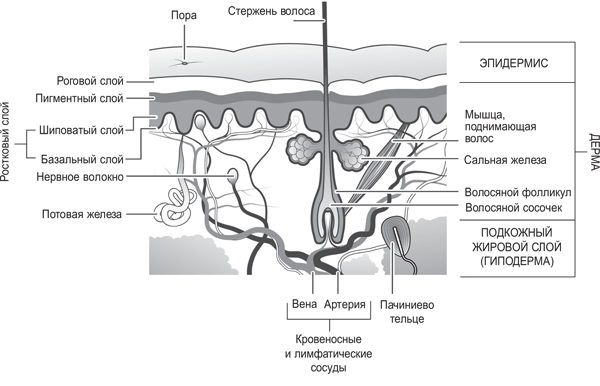 Тело человека защищено кожей. Как и в случае с волосами, цвет кожи зависит от наличия в ней меланиновых пигментов. Как и волосы, самый верхний слой кожи мертв. Крошечные отмершие чешуйки отслаиваются и опадают, внося немалый вклад в появление пыли в доме. Непосредственно под этим омертвевшим слоем, который носит название рогового, расположены еще два слоя – эпидермис, выполняющий защитные функции, и собственно кожа, или дерма. Клетки дермы постепенно поднимаются к поверхности и отмирают, образуя внешний слой. В дерме размещаются также меланоциты – клетки, производящие пигменты.