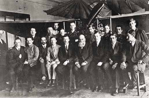 Н. Е. Жуковский в аэродинамической лаборатории МВТУ среди первых русских летчиков и членов воздухоплавательного кружка. 1911 г.