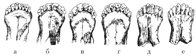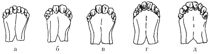 Формы резцов: а – молочные зубы; б – смена зацепов; в – смена внутренних средних резцов; г – смена наружных средних резцов; д – постоянная форма резцов (после смены окрайков)