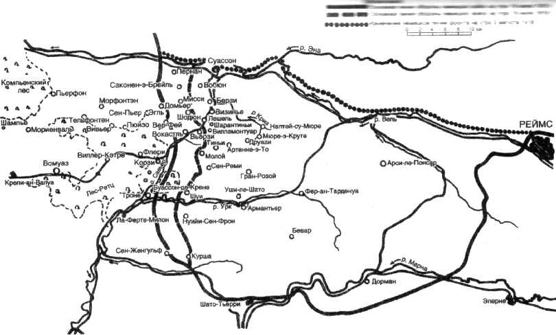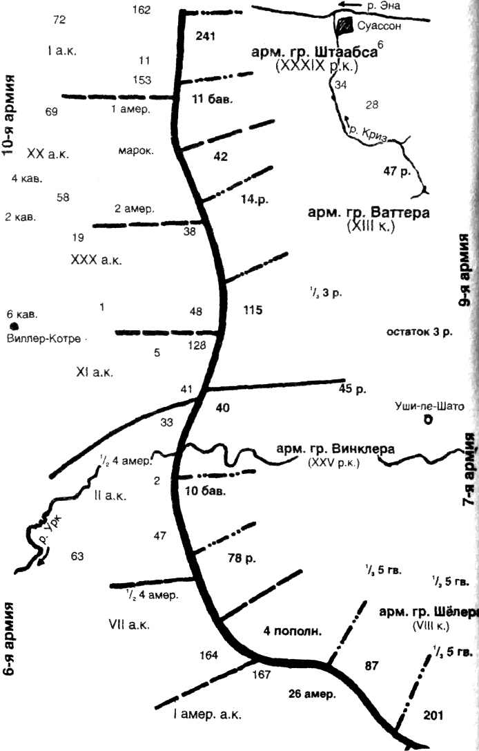 Группа Винклера получила значительные подкрепления в виде 51-й резервной дивизии, которая уже в 7.20 получила приказ двинуться походным порядком к северо-западу из района Бевара. Вскоре после этого, в 11.00, первые подразделения дошли до Армантьер-сюр-Урк, что юго-восточнее Уши-ле-Шато, в 11 километрах от установившейся на тот момент линии фронта. И точно так же, как произошло севернее, обороняющиеся в течение нескольких часов успешно подтянули мощные резервы, что именно и показывает, как мало времени имелось у атакующих сил для достижения подлинного прорыва, даже после того, как его удалось начать с полнейшей неожиданностью. И это было еще тогда, в далеком 1918 году, когда немцам приходилось подтягивать большую часть резервов пешим ходом! 18 июля единственным немецким соединением, обеспеченным грузовиками, была 10-я егерская дивизия, которую транспортировали из Бевара в Наптей-су-Мюре, Мюре-э-Круте и Друази и тем же вечером бросили в бой. Сейчас, имея моторизованные и аэромобильные резервы, мы должны придавать еще большее значение повышению темпа атаки.