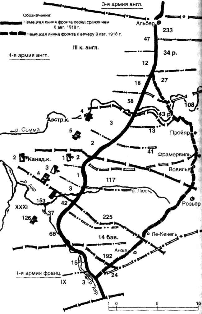 Армии союзников шли в битву с уверенностью в победе, тогда как немцы день за днем с беспокойством ожидали решения своей участи. 6 августа с немецкого самолета доложили об обнаружении сотни танков, двигавшихся от Эльисюр-Нуа к Моризелю. Немцев это не особенно встревожило. 7 августа в саду под Виллер-Бретонне при случайном попадании взлетели на воздух 24 танка снабжения, нагруженные снарядами и горючим. И опять это не вызвало никаких подозрений. 8 августа в 5.20 вражеские атакующие части взрезали утренний туман на протяжении 22-километрового участка линии фронта. Немцы ничего подобного не ожидали. Они не рассчитывали на массированную атаку бронетанковых войск и были бессильны ей противостоять. Штыки были абсолютно бесполезны. Причинят ли какой-нибудь ущерб танкам пулеметы, ручные гранаты и минометы, зависело от удачи. Достичь полного успеха можно было лишь при помощи артиллерии, если бы ее использовали правильно; но в той ситуации перед артиллеристами встала трудная? почти неразрешимая задача, ведь сумрачный свет раннего утра чем дальше, тем больше слабел — его заглушал туман естественного и искусственного происхождения. Ползущий огневой вал поднимал клубы дыма и пыли, множество мишеней появлялось в поле зрения слишком близко, приводя в смятение. Фактически все те орудия, которые находились в зоне действий немецкой пехоты, оказались бесполезны. Чего можно было ожидать от немецких солдат, скорчившихся в своих жалких норах, глядя, как прямо на них движутся танки? Если бы они открыли огонь по машинам или по вражеской пехоте, бегущей следом, их бы увидели из танков и немедленно уничтожили; если бы они не стали стрелять, часть из них могла бы избежать обнаружения и не попасть под обстрел из танков, но тогда вражеские пехотинцы, целые и невредимые, захватили бы их в плен. В тех обстоятельствах, в которых проходила битва 8 августа 1918 года, немецкая пехота была беззащитна перед лицом верной гибели.