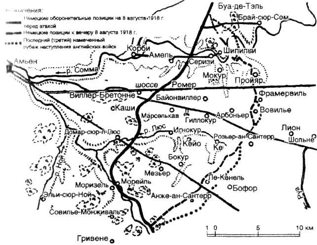 Под Амьеном в распоряжении англичан имелись: а) для действий против немецких резервных дивизий и центров управления — танки «уиппет» и бронеавтомобили, а также большое количество авиации;