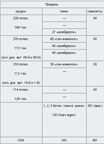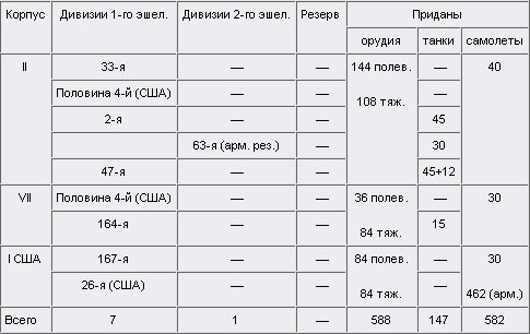 4 пехотные дивизии, из которых 2 находились в тылу XX корпуса и 2 — в тылу XXX корпуса;