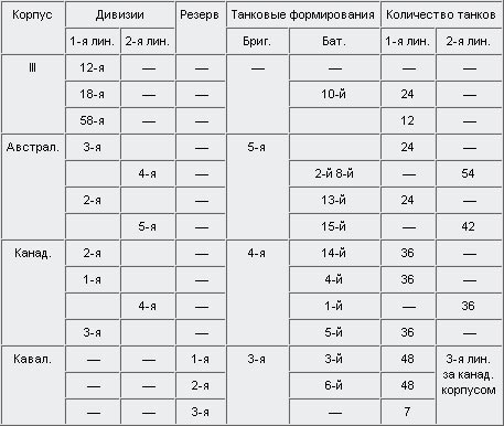 Эти успехи укрепили веру британского высшего командования в ударную мощь английских танковых сил, и оно продолжило подготовку нового мощного удара. На протяжении долгого времени англичане единовластно господствовали в воздухе, что давало им теперь подробные знания о положении немецких позиций, а дальнейшая информация, полученная от пленных и из других источников, не оставляла сомнений насчет состояния и размещения войск противника. Таким образом, 9 немецким дивизиям предстояло столкнуться с 8 английскими и 5 французскими дивизиями. 3 английские и 2 французские пехотные дивизии и 1 английская кавалерийская дивизия оставались в резерве; немецких резервных дивизий насчитывалось 5. Все войсковые соединения союзников отдохнули и были полны сил; то же можно сказать лишь о 2 дивизиях немцев.