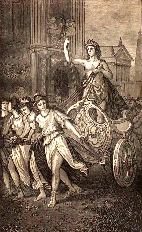 Гелиогабал на колеснице, запряженной красивыми женщинами.
