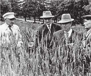 Т. Д. Лысенко и руководство страны на опытном участке. Слева направо: А. И. Микоян[2], М. А. Суслов, Н. С. Хрущёв, Т. Д. Лысенко