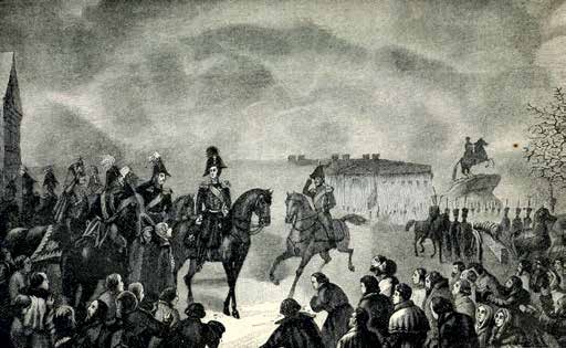 Все было тихо. Выпавший снег заглушал полозья проезжавших саней и звук шагов. Император во главе батальона преображенцев занял позицию на Адмиралтейском бульваре. При нем с самого утра неотлучно находился генерал Бенкендорф. Начав движение почти в одиночку, по дороге к месту событий император постепенно «обрастал» офицерами в генеральских и флигель-адъютантских эполетах. Настроен он был решительно: ровным и громким голосом отдавал приказания и отправлял людей с поручениями в разные концы города.