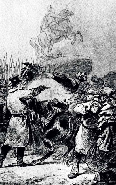 Выстрел П. Г. Каховского в М. А. Милорадовича. Литография с рисунка А. И. Шарлеманя.
