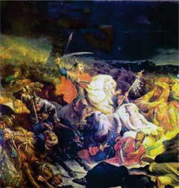 С тем чтобы более подробно разобраться в символических деталях Куликовской битвы, нам придется вновь обратиться к тексту «Сказания…», а именно той его части, в которой описаны действия Владимира Андреевича Серпуховского и Дмитрия Боброка-Волынского, под чьим командованием находился тот самый засадный полк, решивший исход битвы: «Когда же настал седьмой час дня, по божьему попущению и за наши грехи начали поганые одолевать. Вот уже из знатных мужей многие перебиты, богатыри же русские, и воеводы, и удалые люди, будто деревья дубравные, клонятся к земле под конские копыта: многие сыны русские сокрушены. И самого великого князя ранили сильно, и с коня его сбросили… Христианские полки поредели – уже мало христиан, а все поганые».