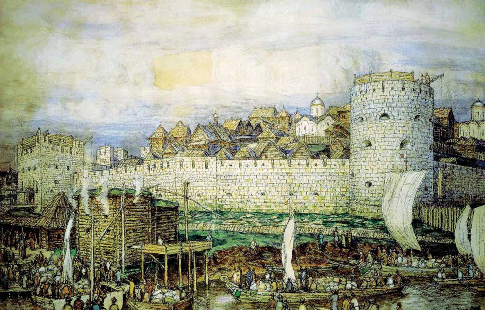 Московский Кремль при Дмитрии Донском перед нашествием Тохтамыша в 1382 году. Художник А. Васнецов
