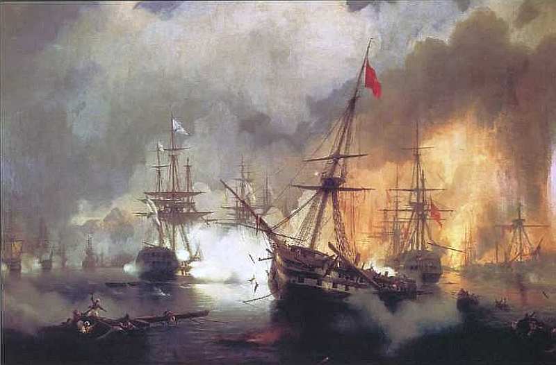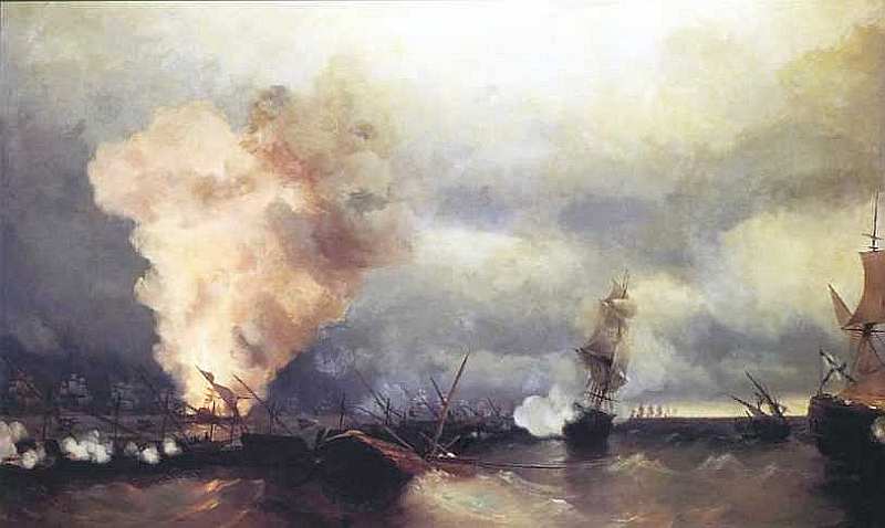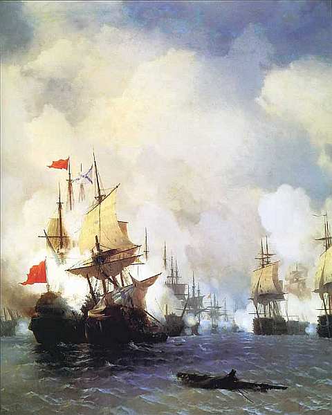 Большое место в творчестве Айвазовского занимает батальная живопись. Художника по праву называют летописцем и певцом русской морской славы. Так, в 1848 он создал два известнейших произведения, посвященных морским сражениям конца XVIII века, — «Чесменский бой в ночь с 25 на 26 июня 1770 года» (1848, Феодосийская государственная картинная галерея им. И. К. Айвазовского) и «Бой в Хиосском проливе 24 июня 1770 года» (1848, Феодосийская государственная картинная галерея им. И. К. Айвазовского). В этих полотнах живописец изобразил ключевые моменты истории и прославил доблесть русского оружия. В картине «Чесменский бой 25–26 июня 1770 года» сражение происходит в ночное время. В глубине бухты видны горящие корабли турецкого флота, один из которых изображен в момент взрыва. Охваченный огнем и дымом, он превратился в пылающий костер. На воде можно различить обломки турецких судов с группами матросов, взывающих о помощи.